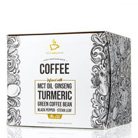 Pure Single Origin Colombian Coffee Bean, MCT Powder (Medium Chain Triglycerides), Siberian Ginseng (Eleutherococcus senticosus), Green Coffee Bean Extract, Turmeric Extract (Curcumin C3 Complex® Std. 95% Curcuminoids), Black Pepper Extract (BioPerine®), Sweetener (Stevia).